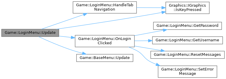 References _graphics, _passwordInput, _usernameInput, HandleTabNavigation(), Graphics::IGraphics::IsKeyPressed(), OnLoginClicked(), and Game::BaseMenu::Update().