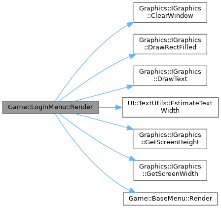 References _errorMessage, _graphics, _passwordInput, _successMessage, _usernameInput, Graphics::IGraphics::ClearWindow(), Graphics::IGraphics::DrawRectFilled(), Graphics::IGraphics::DrawText(), UI::TextUtils::EstimateTextWidth(), Graphics::IGraphics::GetScreenHeight(), Graphics::IGraphics::GetScreenWidth(), and Game::BaseMenu::Render().